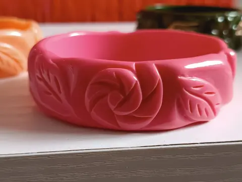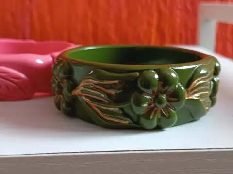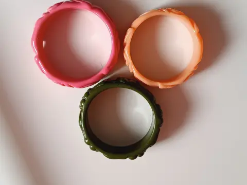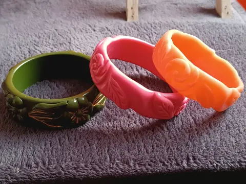 3 braceletes de resina tallada, no es baquelita! Tienen sus años pero no lo categorizaria como vintage Super resistentes y bonitas