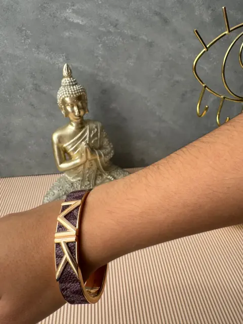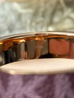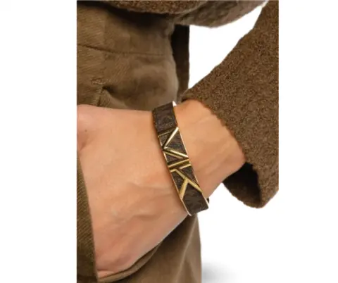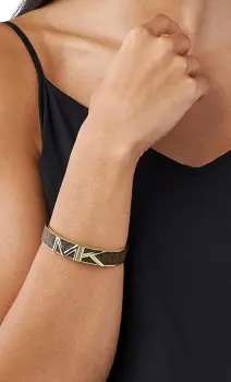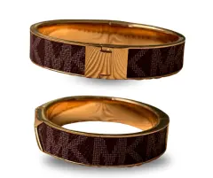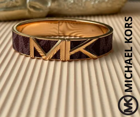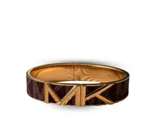 Brazalete de acero y piel Michael KorsCompuesto de acero inoxidable y piel de saffiano y cierre magnético.Medida o longitud interior 61x49.5mm.En tiendas de prestigio éste brazalete está agotado así como en Amazon México.
