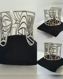 Brazalete Autoajustable Ácero Quirúrgico. Brazalete autoajustable tono PLATA BRILLANTE en ácero quirurgico c/diseño ecléctico. EDICIÓN ESPECIAL "Miguel Ángel Leal by Cristian Lay". Dimensiones cms: 15.5 largo, 5.5 ancho.