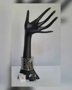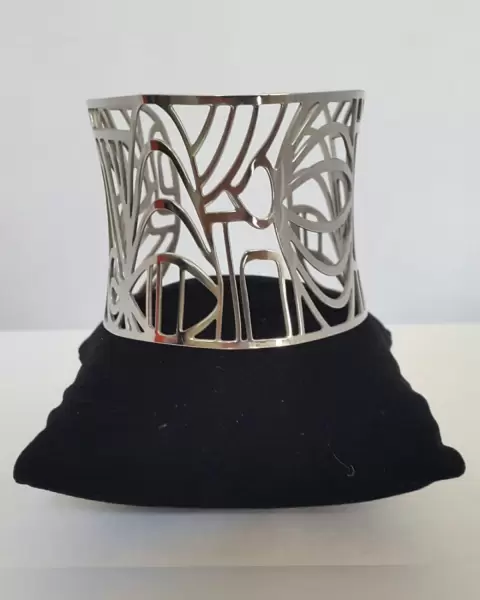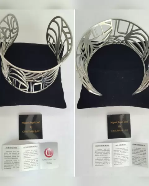 Brazalete autoajustable tono PLATA BRILLANTE en ácero quirurgico c/diseño ecléctico. EDICIÓN ESPECIAL "Miguel Ángel Leal by Cristian Lay". Dimensiones cms: 15.5 largo, 5.5 ancho.