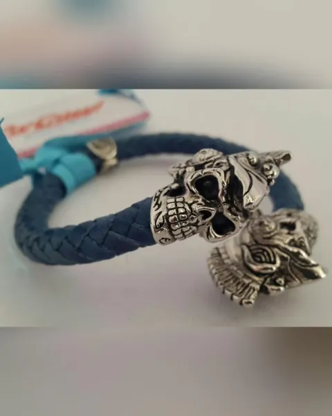 Brazalete en piel de cabra tejida AUTOAJUSTABLE color AZUL COBALTO, c/cabeza doble calavera águila en aleación de metales c/recubrimiento de rodio.***Edición especial del joyero Edgar Ortiz para Ay Güey!*** UNITALLA. Dimensiones cms: 7 diámetro.