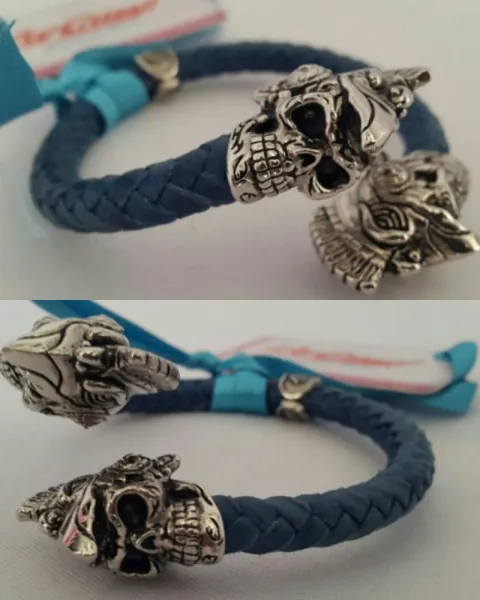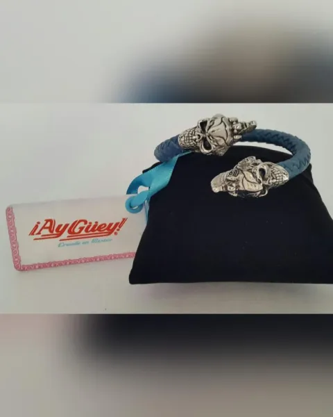 Brazalete en Piel Calavera Águila Doble Azul. Brazalete en piel de cabra tejida AUTOAJUSTABLE color AZUL COBALTO, c/cabeza doble calavera águila en aleación de metales c/recubrimiento de rodio.***Edición especial del joyero Edgar Ortiz para Ay Güey!*** UNITALLA. Dimensiones cms: 7 diámetro.