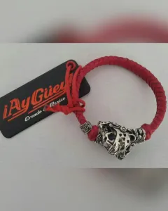 Brazalete en Piel Calavera Jaguar Doble Rojo. Brazalete en piel de cabra tejida AUTOAJUSTABLE color ROJO FUEGO, c/cabeza doble calavera jaguar en aleación de metales c/recubrimiento de rodio.***Edición especial del joyero Edgar Ortiz para Ay Güey!*** UNITALLA. Dimensiones cms: 7 diámetro.