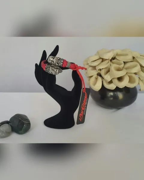 Brazalete en piel de cabra tejida AUTOAJUSTABLE color ROJO FUEGO, c/cabeza doble calavera jaguar en aleación de metales c/recubrimiento de rodio.***Edición especial del joyero Edgar Ortiz para Ay Güey!*** UNITALLA. Dimensiones cms: 7 diámetro.
