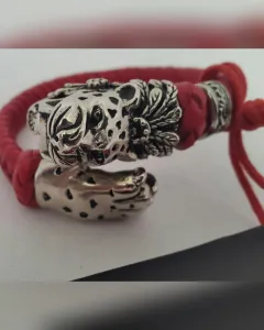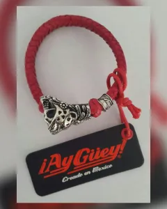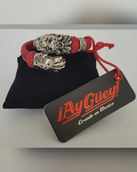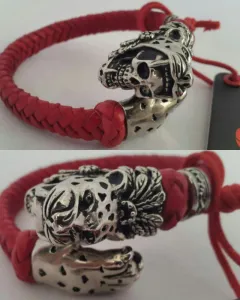 Brazalete en piel de cabra tejida AUTOAJUSTABLE color ROJO FUEGO, c/cabeza calavera jaguar y garra en aleación de metales c/recubrimiento de rodio.***Edición especial del joyero Edgar Ortiz para Ay Güey!*** UNITALLA. Dimensiones cms: 6.5 diámetro.