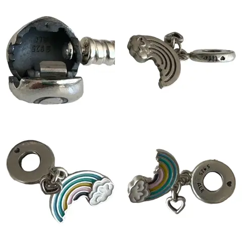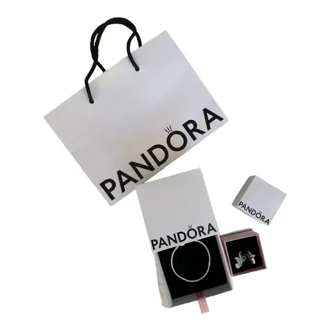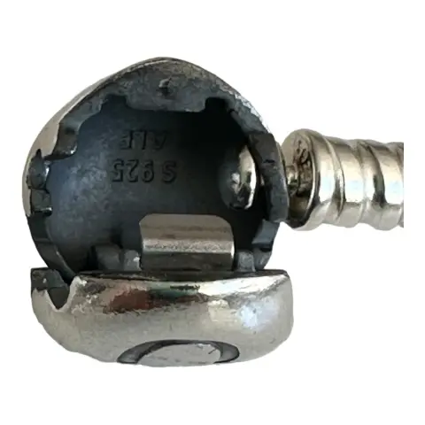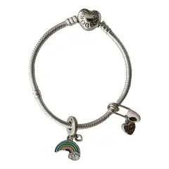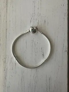 Brazalete Pandora con 2 charms. Acabado a mano con un cierre en forma de corazón, este brazalete de cadena de serpiente de plata esterlina.Talla: 17 cmIncluye ambos charms.Bolsas y cajas de la tienda.