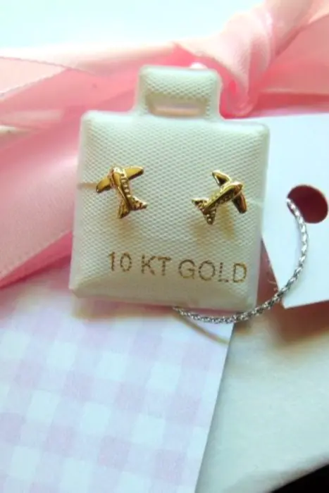 BROQUEL DE 10 KILATES FIGURA DE AVION Su perno mide 8 mm de largo.La figura mide 9 mm de alto y 9 mm de ancho.Disponibles para envio inmediato.