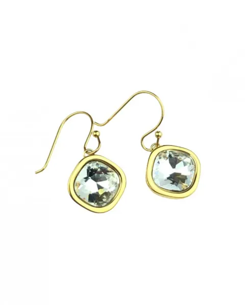 Cadena y dije con piedra brillante en cuadro angular con juego de aretes en acero inoxidable.