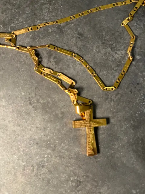 el regalo ideal para esta navidad Cadena y dije modelo Roma, Marcus. Tiene cruz con relieve tanto en cadena y dije lo que lo hace una pieza hermosa.El dije tiene impreso en el relieve una oración con letras minuciosamente labradas en el acero, la cadena tiene como detalle que tiene labrada una cruz en los eslabones.Medidas: dije; 3 cm y la cadena; 26 cm