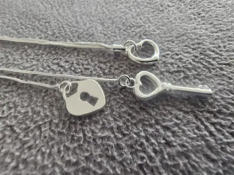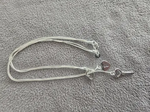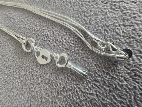 Collar deslizable de corazón de candado y llave.Material: Plata EsterlinaTamaño de cadena: 50 cmTamaño de dijes: llave 3 cm, corazón 2 cmSe entrega en bolsa de organza tipo costalito.Ideal para regalo 🎁Si te gusta alguna otra pieza de mi colección avísame y te armo un paquete. 😉