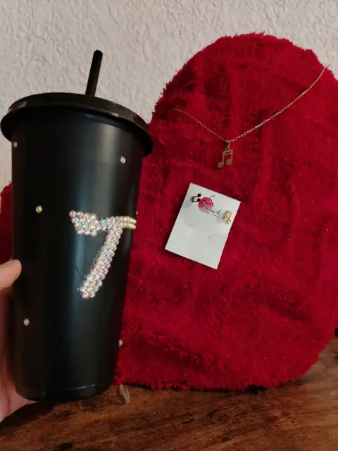 Collar y aretes de nota musicalSon de acero inoxidableViene de regalo un Vaso con popote y tapa esta marcada con piedritas una inicial.Si te llama la atención otro vaso y no te gusta este que está publicado lo puedes cambiar por estos otros disponibles (R, T, M, N & B)