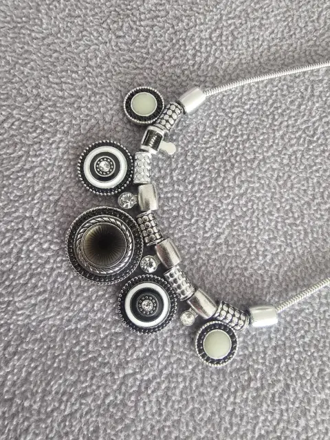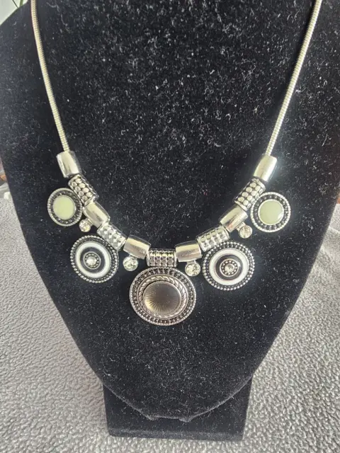COLLAR BLANCO Y NEGRO. Hermoso y elegante collar de círculos blanco y negro.Material: MetalTamaño: 42 + 5 cmTamaño de dije más grande: 3 cmSe entrega en bolsa de tela de organza tipo costal.Ideal para regalo 🎁