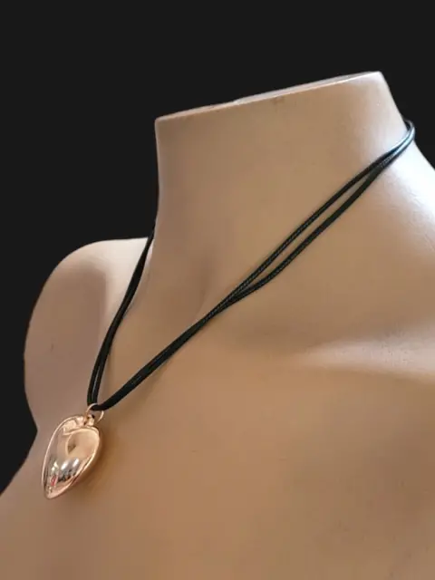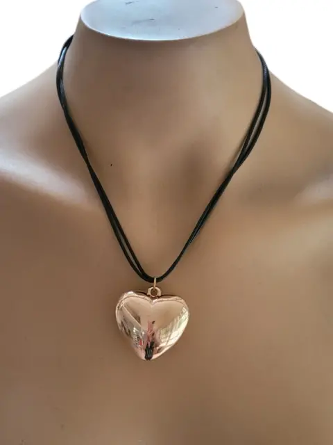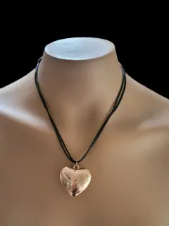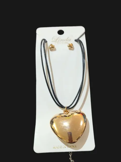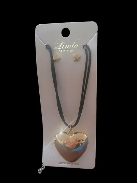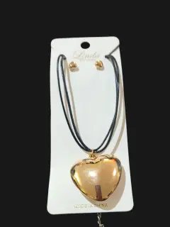 Set de Collar Chocker y aretes en forma de corazon sopranos de Linda New York con dije de ccorazon dorado, el cuerpo es de plastihilo color negro, con broche de rosca plateado, mide 24cm de largo, nuevo a estrenar con etiqueta en buen estado cosmetico.