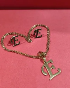 Collar de acero inoxidable con inicial en letra "E"Incluye:Dije de inicialCadenita para dijePar de aretesPar de broqueles