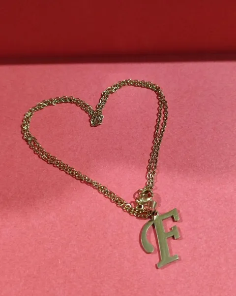 Collar de acero inoxidable con inicial en letra "F"Incluye:Dije de inicialCadenita para dijePar de aretesPar de broqueles