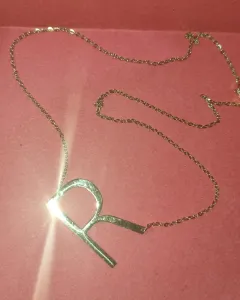 Collar con maxi inicial R. Collar con dije maxi inicial RMide aproximadamente 4 cm y es un poco inclinada Incluye cadenita que mide aproximadamente 40 cm Luce increíble con escote o prendas de cuello alto