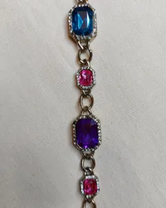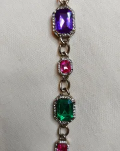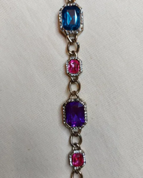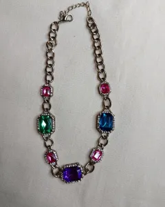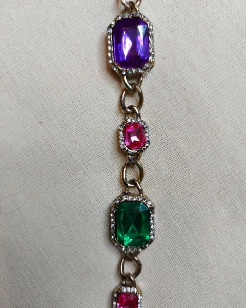 Hermoso collar dorado con piedras de colores, ideal para una fiesta, tiene piedras rosas, una verde, una morada y una azul.
