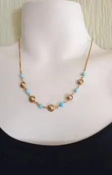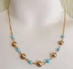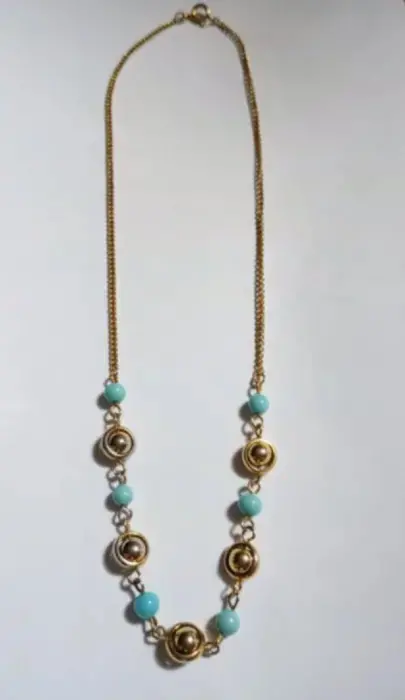 Collar de cadena con cuentas color turquesa y círculos dorados mide 40 cms sin detalles