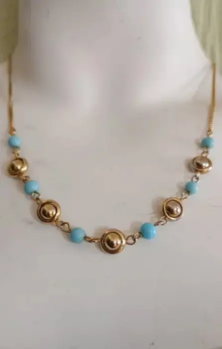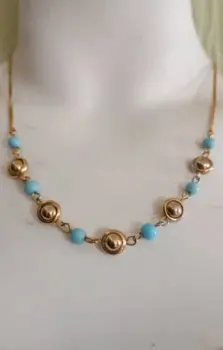 Collar de cuentas. Collar de cadena con cuentas color turquesa y círculos dorados mide 40 cms sin detalles