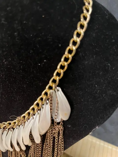 Collar en cascada de hoja de hueso y cadenas metálicas con cuentas brillantes. pieza destacada de manufactura, tipo boho o bohemio