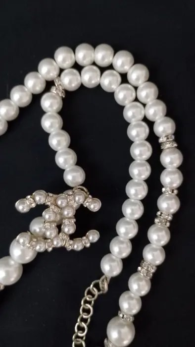Collar de perlas con anillos brillantes entrelazados, logo CC, broche de ganchito.Medida 44 centímetros. Incluye caja y shopping bag.