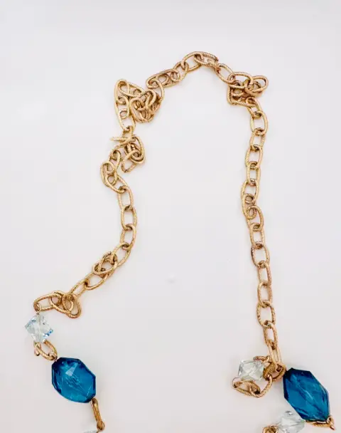 Collar de fantasía color dorado Largo 60 cmsCon cuentas de plástico color azul-gris
