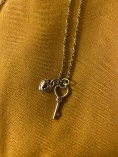 Collar llave y candado. Collar con 2 dijes de acero inoxidable, 1 dije diseño de candado de corazón con abertura en medio en forma de entrada para llave y 1 dije con diseño de llave colgada del candado de corazón medidas la Cadena es de 50 cm el dije de llave mide 2.5 cm y el corazón 1 cm