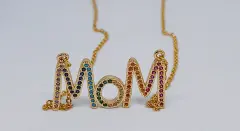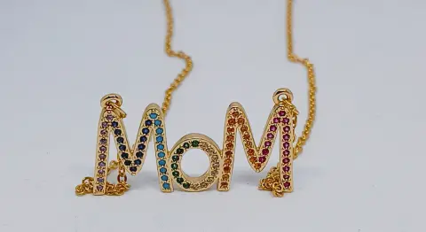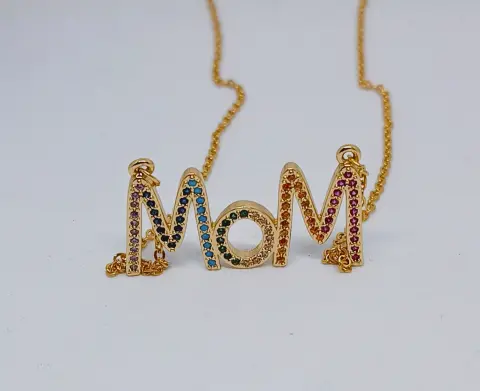 Hermoso collar en acero inoxidable en color dorado con la palabra Mom, tiene zirconias en varios colores