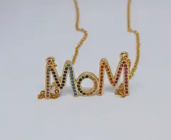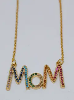 Collar Mom. Hermoso collar en acero inoxidable en color dorado con la palabra Mom, tiene zirconias en varios colores