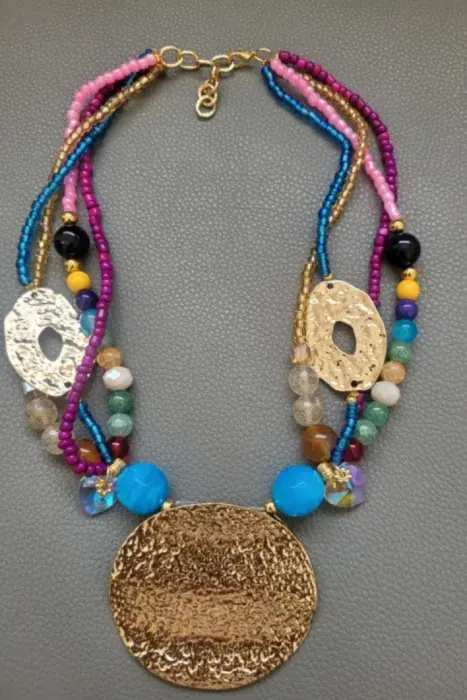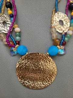 Precioso collar en diversos tonos, elaborado con cristales, piedras y corazones en cristal, cuentas color dorado en acero inoxidable y dije grande dorado redondo también en acero inoxidable