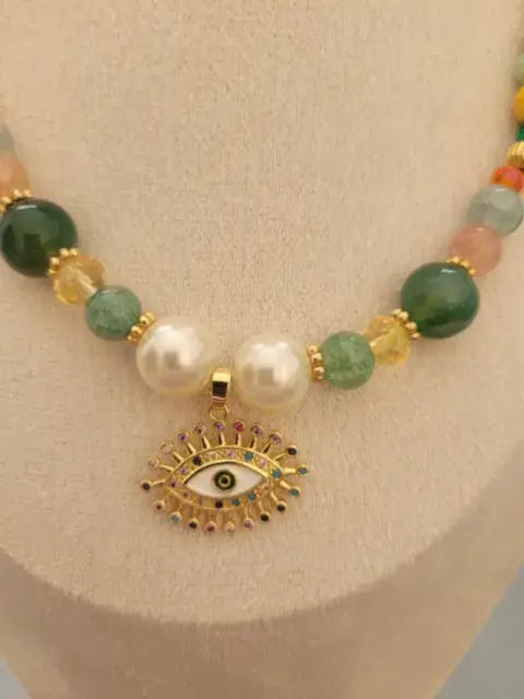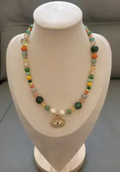 Hermoso collar en cristales multicolor y cuentas y separadores en acero inoxidable color dorado, hermoso dije de acero inoxidable con pequeños cristales multicolor
