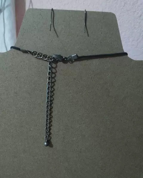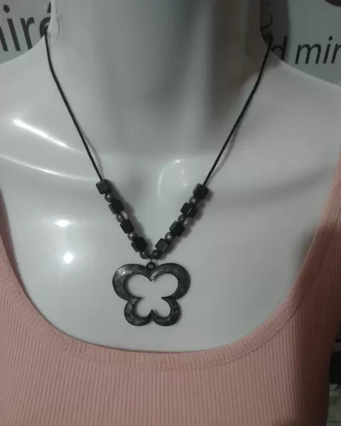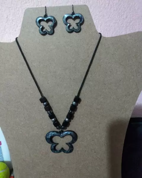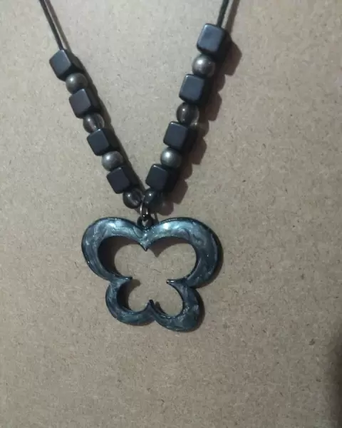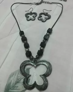 Collar negro hilo de raton en naylon con cuentas redondas piedra de luna de acrílico transparente ahumado, cuentas de pirita y cuentas cuadradas de madera. Dije y aretes de mariposa en acero con terminado tipo obsidiana nevada. Medidas: 31 cm de largo mas 10 cm de extensión. Aretes 1.5cm. Dije 3.5 cm.