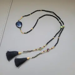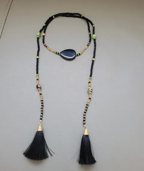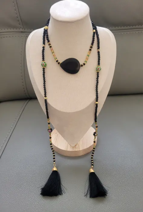 Collar negro bohemio. Hermoso collar en cristales negros, cuentas en color negro, cristales en color verde y dorado, con cuentas y separadores dorados en acero inoxidable, terminado en borlas negras
