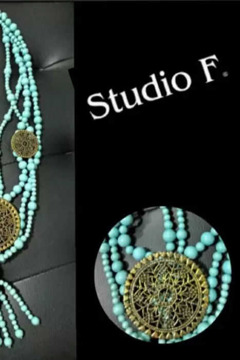 Collar studio F. Collar largo Studio F, Estilo boho color turquesa, con detalles tipo soles color oro viejo.