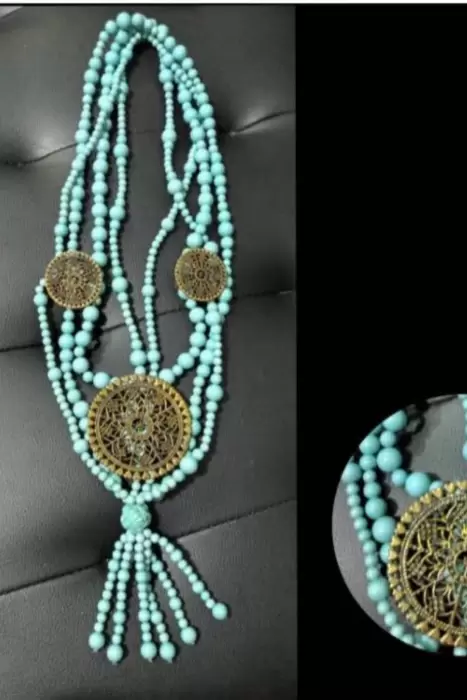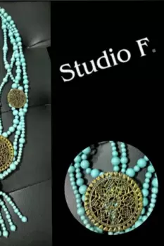 Collar largo Studio F, Estilo boho color turquesa, con detalles tipo soles color oro viejo.