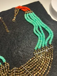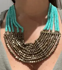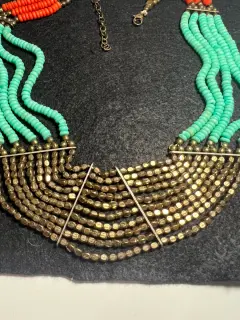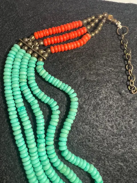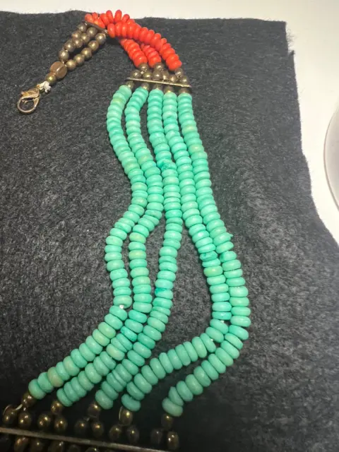 Espectacular collar de turquesa, con piedras color bronce y coral…. luce hermoso, muy vistoso… es un poco pesado y no va muy pegado al cuello..!