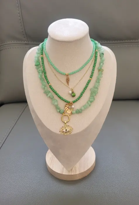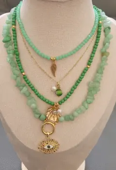 Hermoso collar completo de 4 en 1 ; en piedras y cristales en color verde agua, chasuiras en tonos verdes; dijes en color dorado en chapa de oro y acero inoxidable así como cuentas separadores en acero inoxidable color dorado