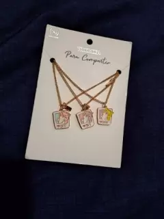 Collares de amistad. Juego de tres collares de fantasía fina, que consta de tres soguillas y un colgante por cada soguilla. Los colgantes son de gatos de colores: rosa, lila y amarillo. Ideales para compartir con tus mejores amigas.