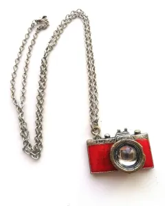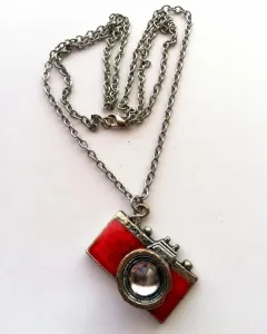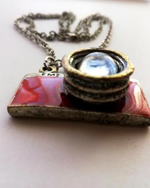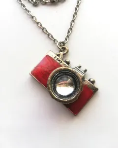 Dije cámara fotografica vintage. Las medidas de la cámara son 4 x 2 cm, el lente es una piedrita de cristal