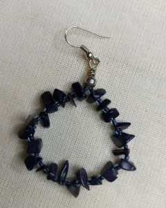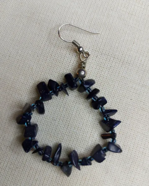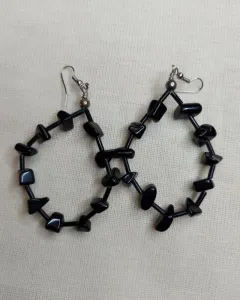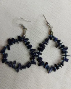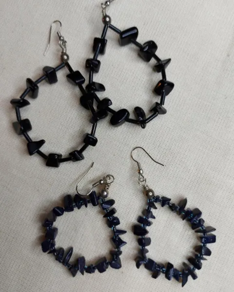 Dos juegos de arracadas, unas son negras y otros azules con piedras muy bonitas. Las negras parecen obsidiana ( las arracadas grandes) y las chicas son azules parecen ojo de tigre azul.
