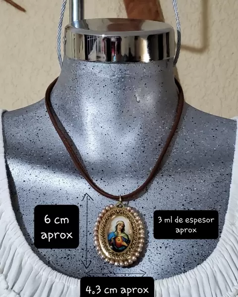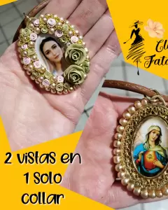 Gargantilla diseño Artesanal con tamaño ajustable, imagen Virgen de la Paz y Virgen Corazon de MariaColor de collar cafe moka con detalles doradosMateriales:Medalla con incrustaciones de fantasía, perlitas, diamantes y un toque delicado de flores de pasta francesa.Collar de cuero sinteticoCadena y Gancho en dorado.Empaque: se envia en una bolsita de organza, lista para el empacado personalizado que le gustes dar." TE ENCANTARA "