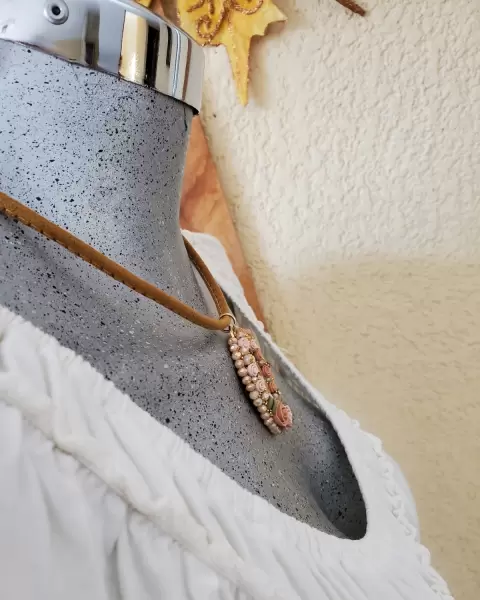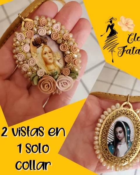 Gargantilla diseño Artesanal con tamaño ajustable, imagen Virgen de Fatima y Virgen de GuadalupeColor de collar cafe claro con detalles doradosMateriales:Medalla con incrustaciones de fantasía, perlitas, diamantes y un toque delicado de flores de pasta francesa.Collar de cuero sinteticoCadena y Gancho en dorado.Empaque: se envia en una bolsita de organza, lista para el empacado personalizado que le gustes dar." TE ENCANTARA "