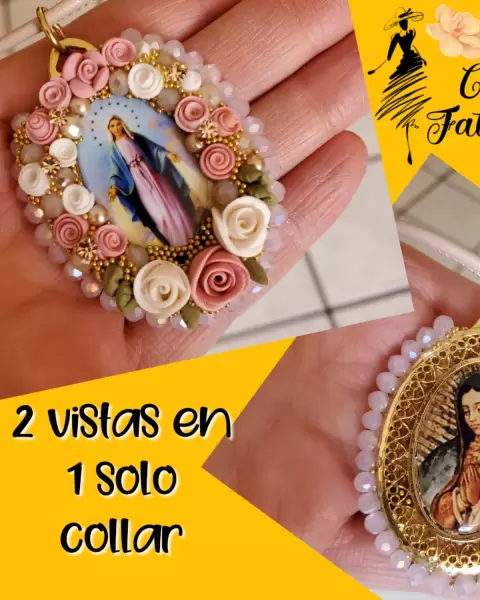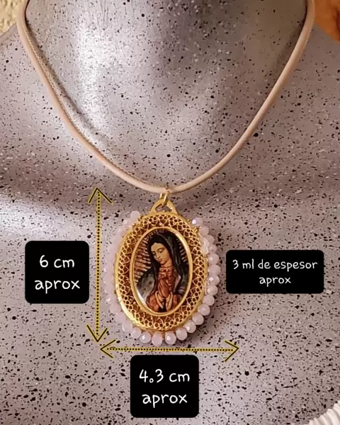 Gargantilla diseño Artesanal con tamaño ajustable, imagen Virgen Milagrosa y Virgen de Guadalupe.Color de collar beige claro con detalles doradosMateriales:Medalla con incrustaciones de fantasía, perlitas, diamantes y un toque delicado de flores de pasta francesa.Collar de cuero sinteticoCadena y Gancho en dorado.Empaque: se envia en una bolsita de organza, lista para el empacado personalizado que le gustes dar." TE ENCANTARA "