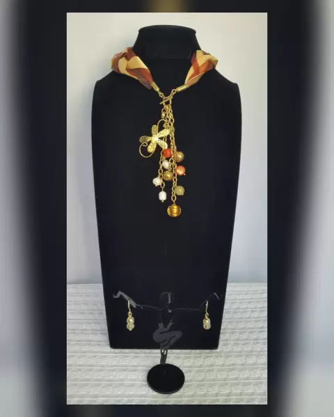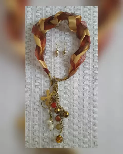 Gargantilla en listón trenzado tonos TABACO/DORADO/COBRE c/dije flor, cadenas, perlas imitación y bisutería tonos TIERRA y DORADA.***INCLUYE ARETES A JUEGO***Dimensiones cms: 45.5 largo, 15 largo apliques, 4 aretes.