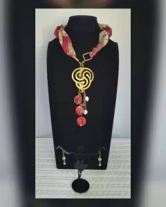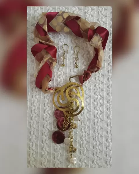 Gargantilla en listón trenzado tonos VINO TINTO/DORADO c/dije trebol, cadenas, perlas imitación y bisutería tonos VINO TINTO y DORADA.***INCLUYE ARETES A JUEGO***Dimensiones cms: 47 largo, 15 largo apliques, 4 aretes.