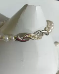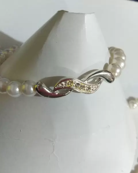 Gargantilla y Brazalete de Perlas.. Gargantilla y brazalete de perlas blancas sintéticas. Gargantilla de 40 cm + 9.5 cm de extensión. Dije de 45x54 mm, perla sintética de 6 mm, con 17 piedras de cristal. Brazalete de 16 cm, con detalle de 6x32 mm, con 14 piedras de cristal. Perlas artificiales fe calidad que no se decoloran.💝 Si te gusta alguna otra prenda de mi clóset, podemos armar un paquete a un excelente precio!