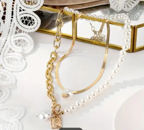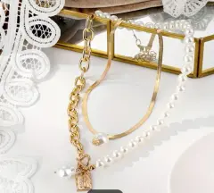 Hermoso juego de collar de perlas, perlas en color blanco y cadena de color dorado, nuevo sin detalles