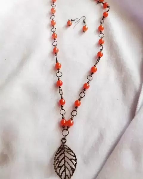 Juego anaranjado hoja. Bonito juego de collar y aretes en perlas de vidrio lisas anaranjado y hoja de metal, bonito para resaltar un look casual