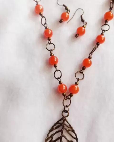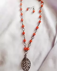 Bonito juego de collar y aretes en perlas de vidrio lisas anaranjado y hoja de metal, bonito para resaltar un look casual