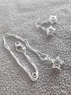 Hermoso juego de collar con dije y aretes de estrella.Material: Plata Esterlina y cristalTamaño cadena: 45 cmTamaño dije: 1.5 cmTamaño aretes: 1.5 cmSe entrega en bolsa de organza tipo costal.Ideal para regalo 🎁Si te gusta cualquier otro artículo de mi colección te hago paquete 😉